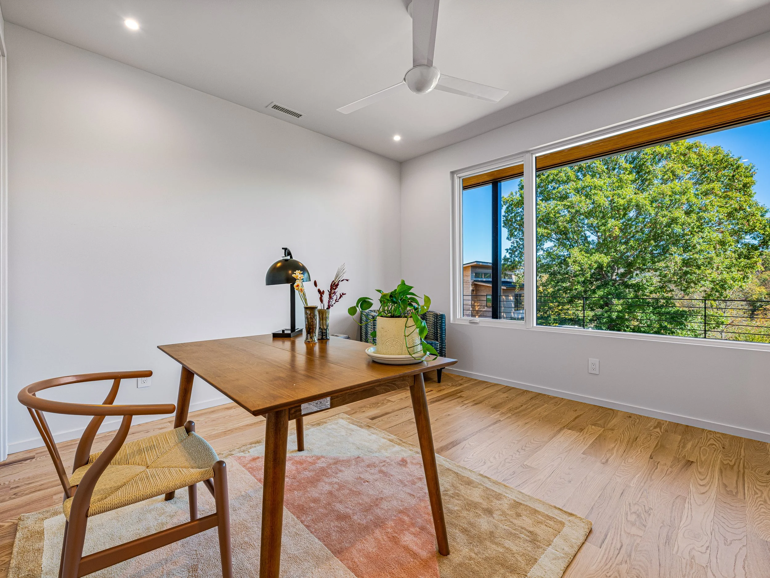 Upon entry, the home opens to distant ridge views. An open kitchen and living room provide an easy setting for entertaining. The kitchen includes quartz countertops and an integrated appliance suite—refrigerator, dishwasher, and induction range. Oak flooring unifies the upper and lower levels.