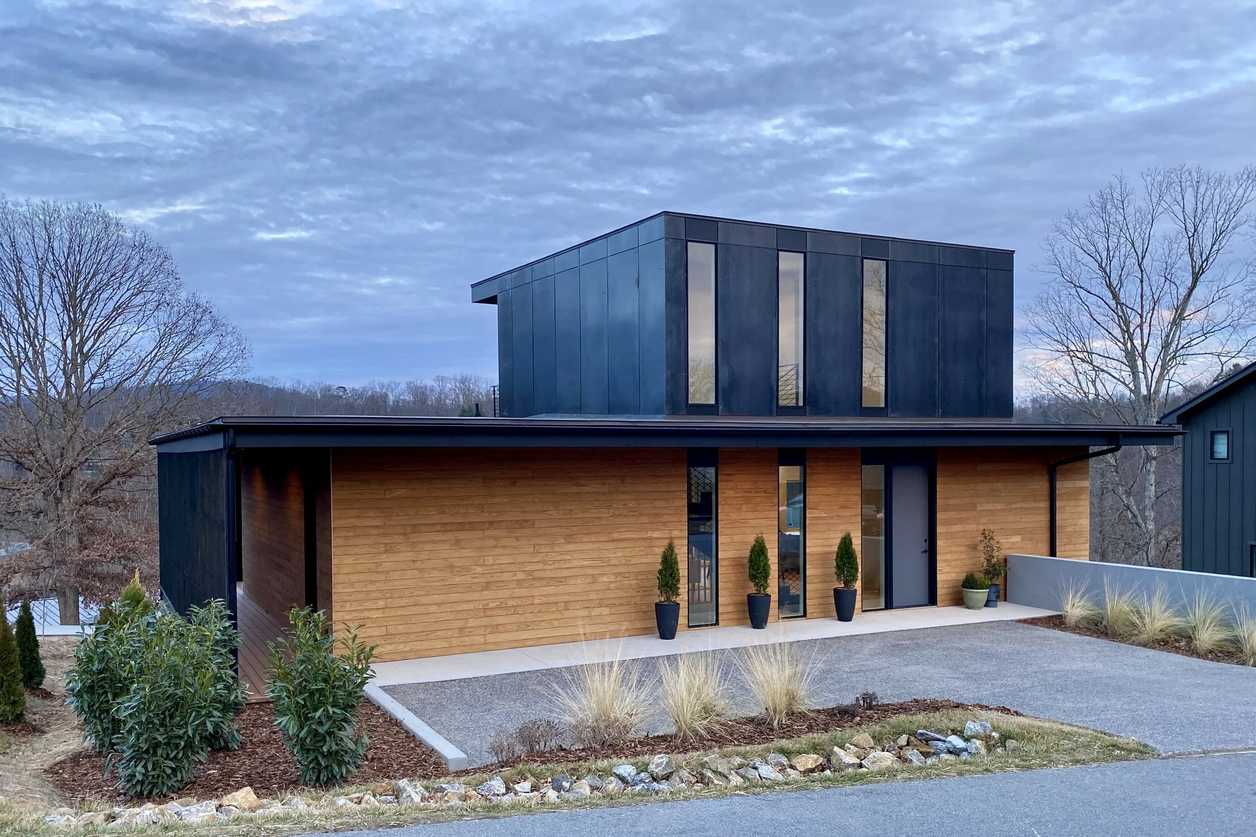 502 Wilma Dykeman is a contemporary home in the riverside community of Olivette, thoughtfully designed by Robinson Design Studio. Situated in the Overlook section, the home sits above the landscape with long views across the neighborhood, the river, and the rolling hills beyond.